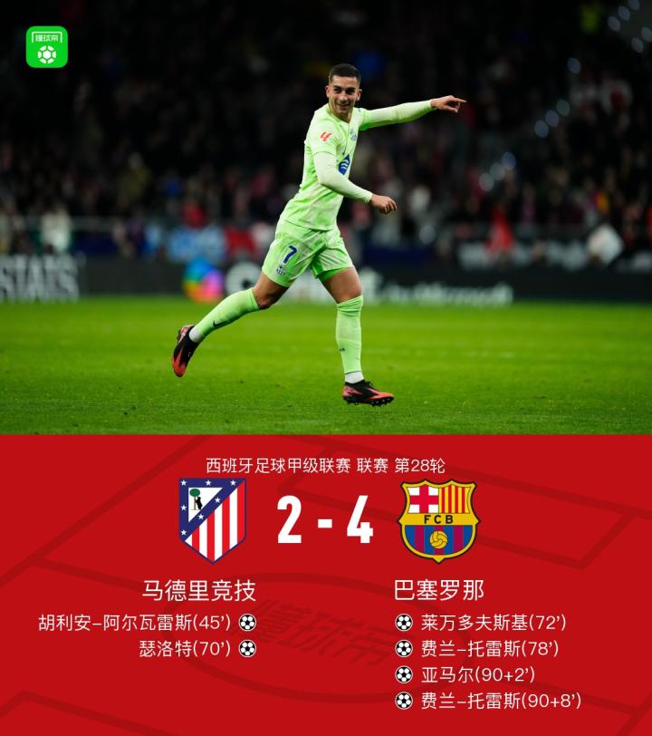 最后时刻,巴塞罗那队员们趁着马德里竞技的失误再度发起进攻。第90+8分钟,费兰-托雷斯在禁区内接到传球,推射破门,最终锁定胜局,将比分改写为4-2。全场比赛结束,巴塞罗那客场击败马德里竞技,取得宝贵的三分。